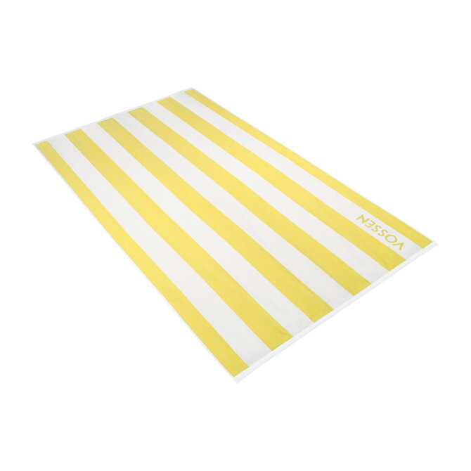 - Iconisch design: Het strepen‑dessin in opvallend geel (zitrus) geeft een moderne, zomerse uitstraling die opvalt tussen traditionele strandlakens.