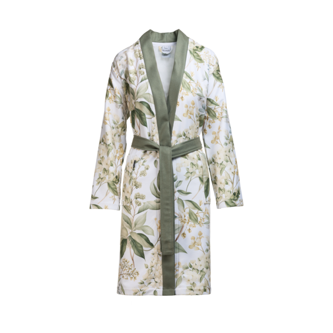 Ontdek de Vandyck Badjas Camille creamtan Small: een verfijnde katoenen badjas die luxe en comfort moeiteloos combineert. Deze badjas valt op door een zachte cream-tan basis verrijkt met een stijlvol bloemen- en plantendessin in groen — een perfecte keuze voor wie een vrouwelijke, natuurlijke uitstraling zoekt in een maat S.