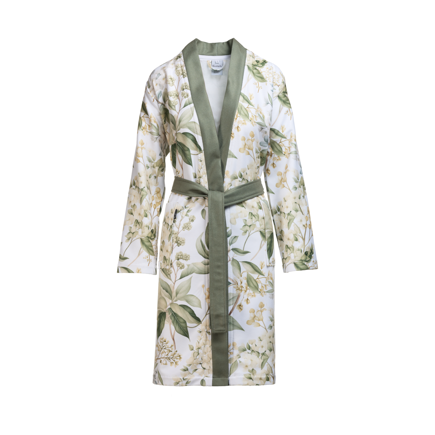De Camille badjas van Vandyck is onderdeel van onze collectie luxe dames badjassen en staat voor hoogwaardige kwaliteit en doordacht design. Gemaakt van puur katoen biedt deze badjas een aangename zachtheid en uitstekende vochtopname, ideaal na een warme douche, een bezoek aan de sauna of gewoon voor relaxmomenten thuis. Het subtiele bloemen & planten dessin geeft een elegante, tijdloze look die zowel modern als klassiek aanvoelt.